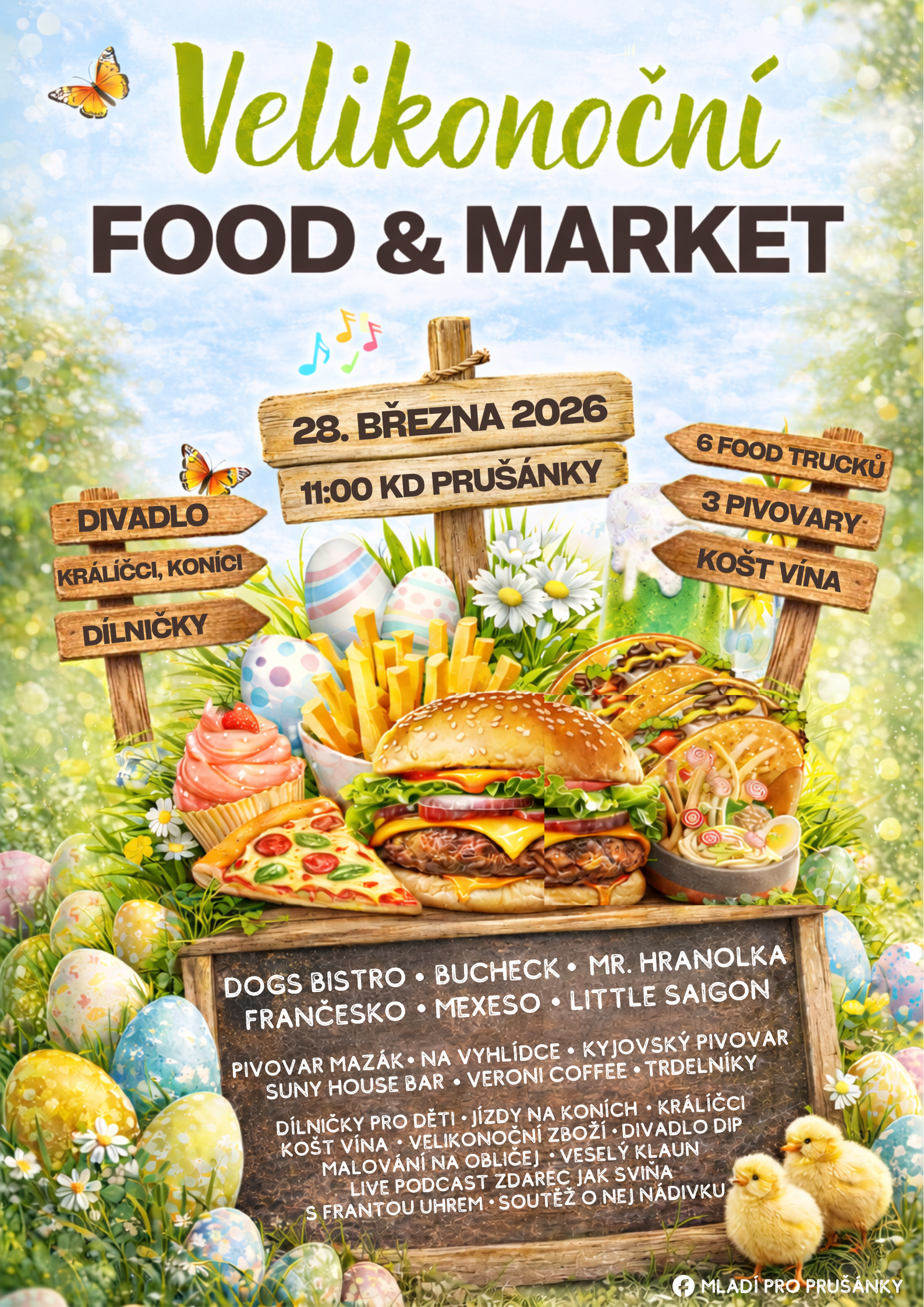 Velikonoční FOOD & MARKET je tady! Program pro celou rodinu v sobotu 28. března od 11 hodin na Kulturním domě v Prušánkách. To nejlepší z burgerů, Mexika, Neapole i Vietnamu na jednom místě. 6 FOOD trucků, 3 pivovary, košt vína, velikonoční dílničky, divadlo, klaunské představení pro děti, taneční workshop, dekorace a mnoho dalšího. Nebudete vědět, kam dřív skočit.